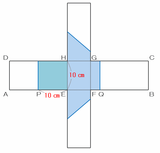 つまり、辺PEの長さは8+2=10㎝なので、45度傾けたときの様子を次のような展開図に表してみると、面AEHDが水に触れている部分の面積は10×10=100㎠になります。