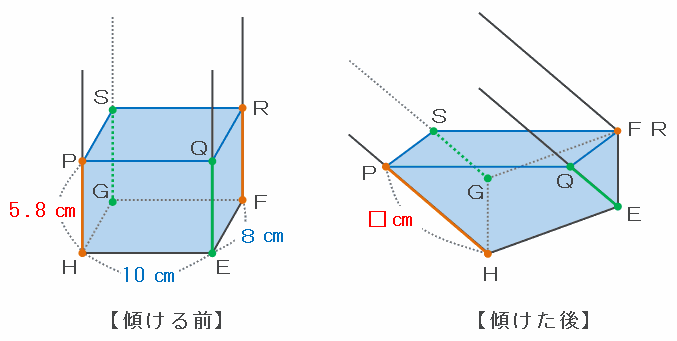 次の図のように、容器を傾ける前の水の深さは5.8㎝なので、オレンジ色の辺PHとRF、緑色の辺QEとSGの合計はどちらも5.8×2=11.6㎝です。
