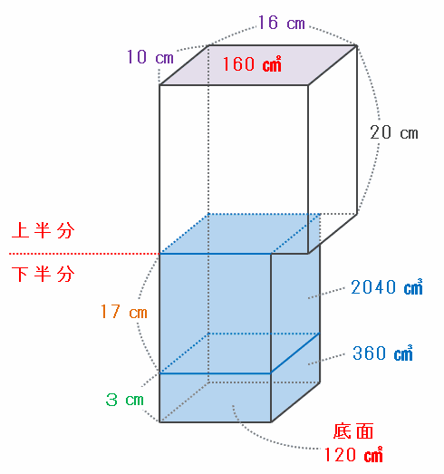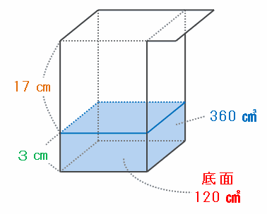 上の図を見れば分かるように、容器の下半分にはまだ深さ20-3=17㎝分のすきまが残っており、その部分を満たすのに必要な液体の量は120×17=2040㎤です。