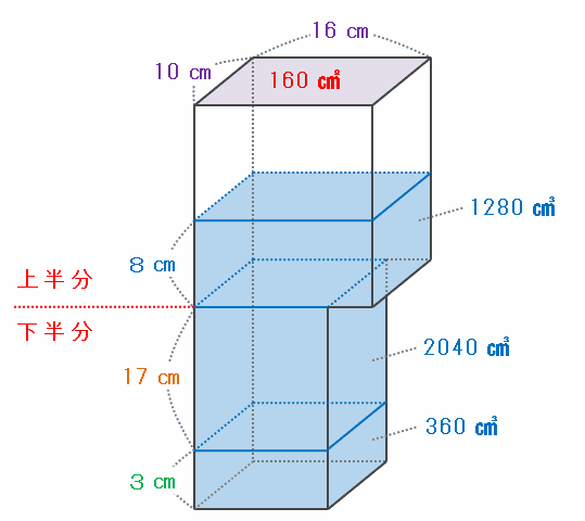 つまり、再び容器に液体を注ぎ始めてから1時間40分後には、上の図のように液面が容器の下半分からさらに8㎝上まで来ているので、答えは20+8=28㎝になります。