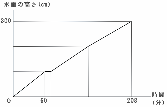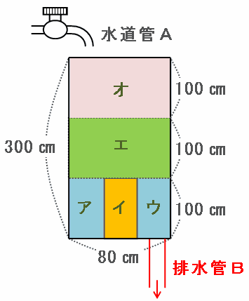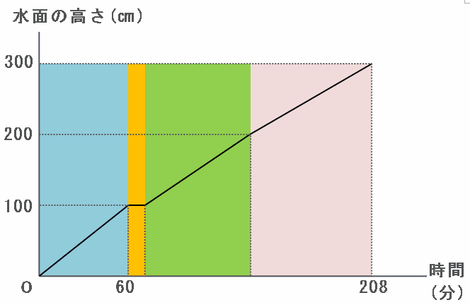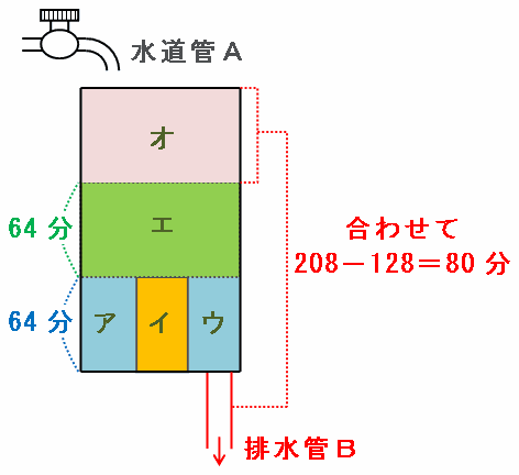 そして、水面の高さが300㎝になるのにかかる時間は208分(グラフから読み取れます)なので、下の図のオを満たすのにかかる時間と排水管Bから水が出ていった時間の合計は、208-64×2=80分になります。