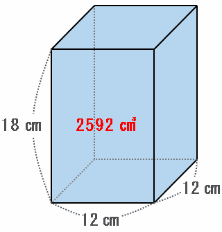 まずはこの容器全体の容積から求めてみると、次の図のように底面は1辺12㎝の正方形で高さは18㎝なので、容積は12×12×18=2592㎤になります。