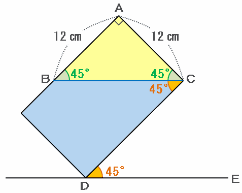 また、角BACは直角、角ABCは180-(90+45)=45度なので、三角形ABCは直角二等辺三角形になっています。