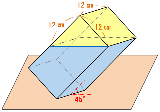 その部分は三角柱(あるいは立方体の半分)になっているので、容積は12×12÷2×12=864㎤になります。