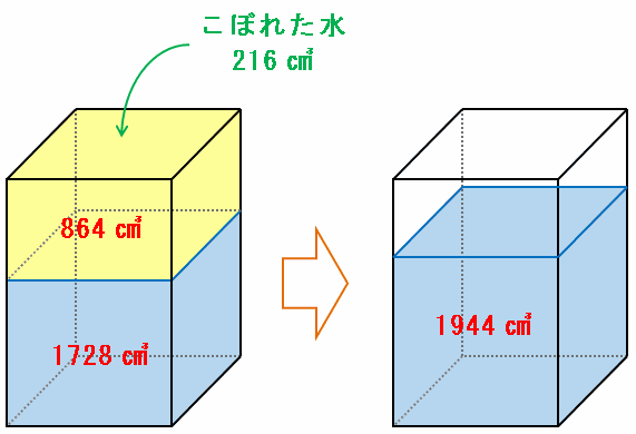その容器にこぼれた水をすべて戻してあげると、水の量は1728+216=1944㎤に増えます。
