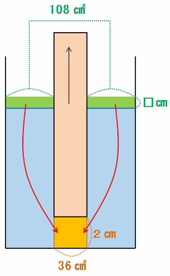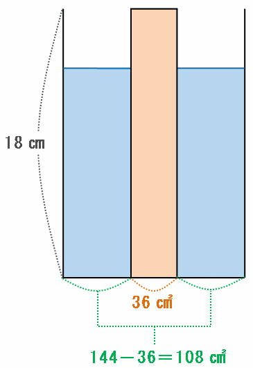 その棒を次の図のように水の中へ突っ込むと、容器の底面積は144-36=108㎠に減ります。