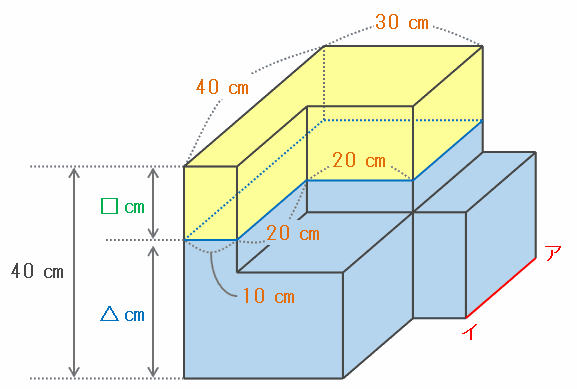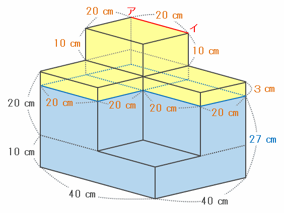 たて20㎝、横20㎝、高さ3㎝の直方体3個分の容積は20×20×3×3=3600㎤、そしてたて20㎝、横20㎝、高さ10㎝の直方体1個の容積は20×20×10=4000㎤なので、容器の上部にあるすき間の容積は3600+4000=7600㎤になります。