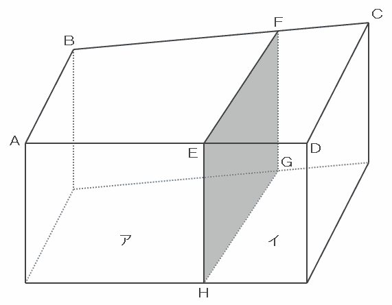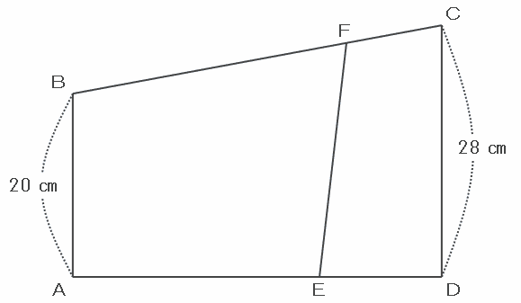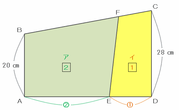 次の図のような底面が台形の四角柱の容器に、しきり板EFGHが入っています。アの部分に、水面が容器の高さと同じになるまで水を入れてから、しきり板EFGHを取り除いたら、水面の高さが容器の高さの3分の2になりました。AE:ED=2:1、AB=20㎝、CD=28㎝のとき、BFの長さとFCの長さの比を求めなさい。