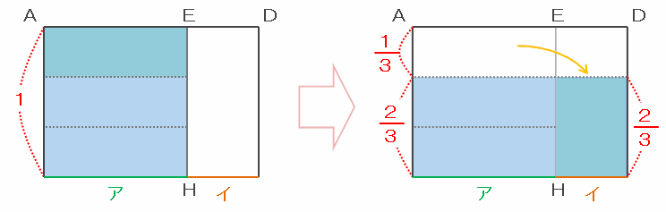 つまり、上の図で「アの底面積×3分の1」と「イの底面積×3分の2」の体積が等しいので、アとイの底面積の比はア:イ=3分の2:3分の1=2:1になります。