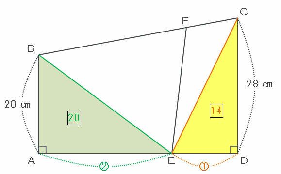 次の図のように、頂点BとE、CとEをそれぞれ直線で結ぶと、2つの直角三角形BAEとCEDができ、BAEの面積は2×20÷2=20、そしてCEDの面積は1×28÷2=14と表すことができます。