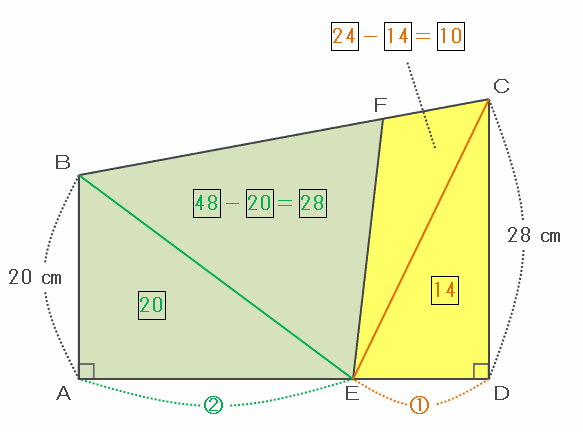 次の図の四角形BAEFの面積は48、直角三角形BAEの面積は20なので、三角形BEFの面積は48-20=28となります。