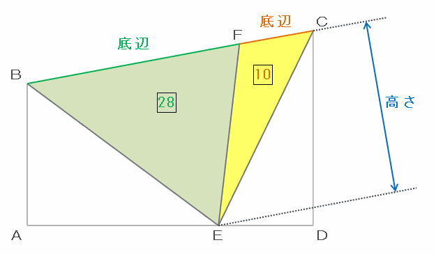 その2つの辺の長さの比が面積比と等しいので、BF:FC=28:10=14:5になります。