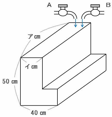 次の図のように大きい直方体から小さい直方体を切り取った形の水そうがあります。A管、B管ともに1分間に16リットルの割合で水が入ります。