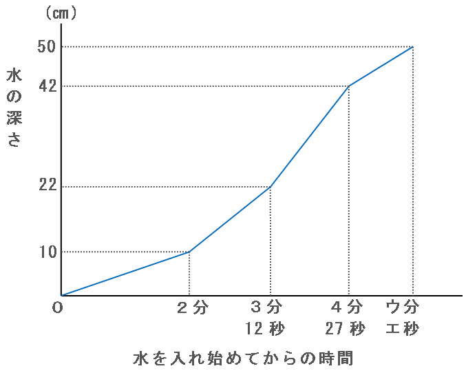 16000㎤はB管から1分間で入る水の量と等しいので、容器の水の深さが50㎝になった時間は4分27秒+1分=5分27秒になります。