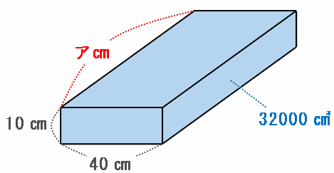上の図の体積はア×40×10=32000㎤という式に表すことができるので、アにあてはまる数は32000÷(40×10)=80になります。