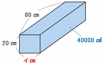 さっきと同じように、その1.25分間で水が入った40000㎤の部分だけを図に表してみると、次のようなたて80㎝、横イ㎝、高さ20㎝の直方体ができます。