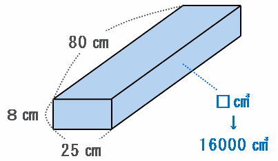 上の図の体積は80×イ×20=40000㎤という式に表すことができるので、イにあてはまる数は40000÷(80×20)=25になります。