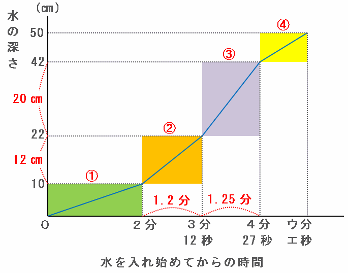 グラフから、水の深さが42-20=22㎝増えるのにかかった時間は、4分27秒-3分12秒=1分15秒=1.25分であることが分かります。