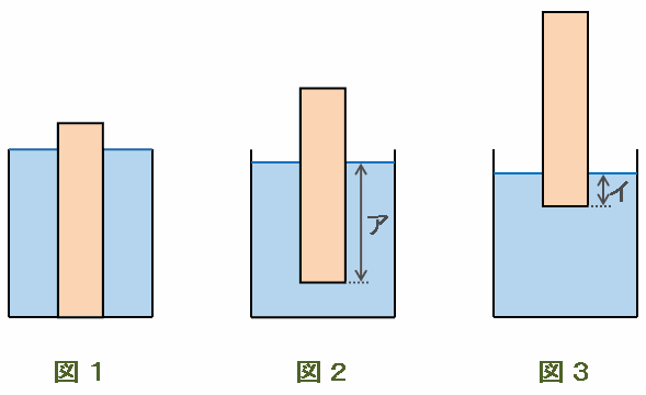 柱を3.2㎝持ち上げたら、水面が0.8㎝下がりました。図2はこの様子を表しています。次に、図3のように、イの長さが図2のアの長さの7分の2倍となるように柱を持ち上げたら、水面がさらに1.2㎝下がりました。