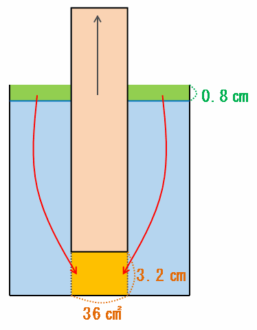 ① 柱を3.2㎝持ち上げた→水面は0.8㎝下がった