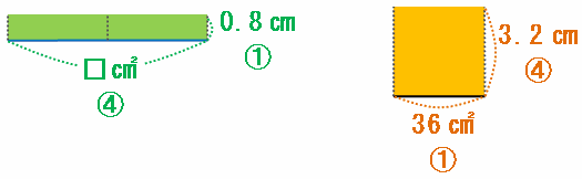 また、緑色2か所とオレンジ色の高さの比は0.8㎝:3.2㎝=1:4なので、底面積の比をその逆の4:1にしてやれば、2つの立体の体積は同じになります。