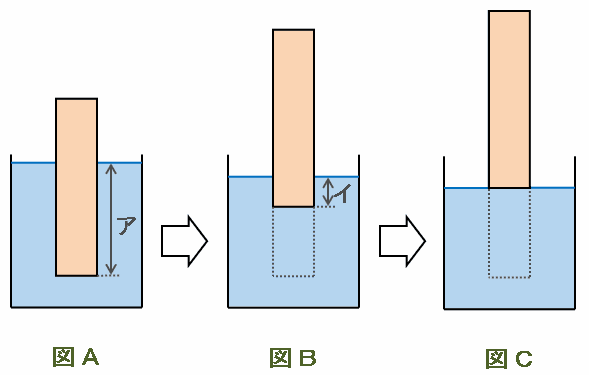 つまりアの7分の1を持ち上げるごとに水面は1.2÷5=0.24㎝ずつ下がるので、下の図Bから図Cのように残りの7分の2を持ち上げたとき、水面はさらに0.24×2=0.48㎝下がります。