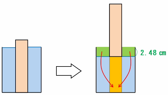 つまり、柱が容器の底に触れている状態から水中を脱出する状態まで持ち上げることにより、次の図の緑色2か所の水がオレンジ色の部分に流れこみ、水面は0.8+1.2+0.48=2.48㎝下がることが分かります。