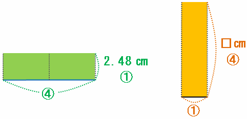 つまりオレンジ色の部分の高さは緑色の高さの4倍である2.48×4=9.92㎝になるのですが、容器の高さは緑色とオレンジ色の高さの合計と等しいので、2.48+9.92=12.4㎝になります。