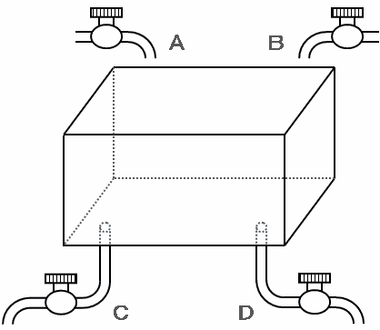 図のように、4つの管A、B、C、Dのついた水そうがあります。この4つの管は開くと1分間あたりそれぞれ一定の量の水を流すことができ、管AとBは開くと水そうに水をいれることができ、管CとDは開くと水そうから水を抜くことができます。