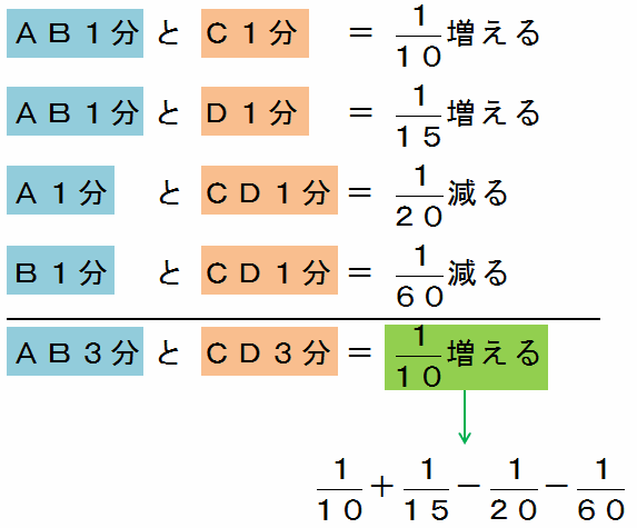 AB10分とC10分で水そうの水の量は1増えるので、AB1分とC1分を使うと、水そうの水の量は1÷10=10分の1増えます。