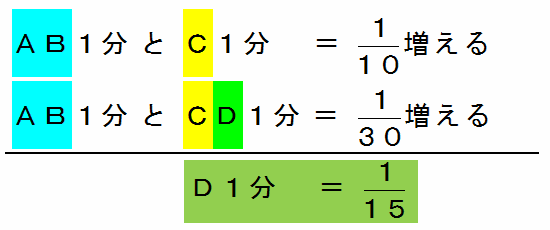 そこで、今度は「AB1分+CD1分=30分の1増える」と「AB1分+C1分=10分の1増える」という2つの条件を次の図のように消去算っぽく扱うと、D1分で水そうの水は15分の1減ることが分かります。