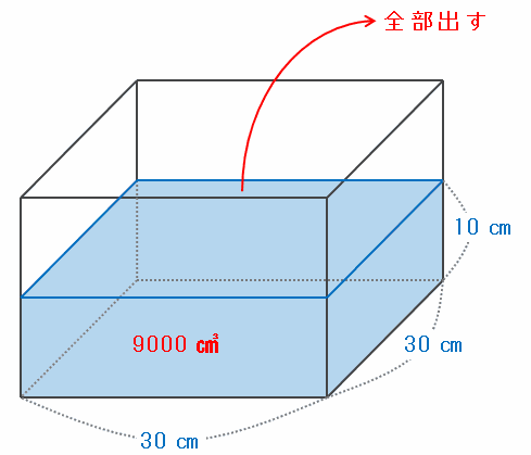 次の図の容器Aには30×30×10=9000㎤の水が入っていますが、まずはその水を全部出して別の場所に移しておきます。