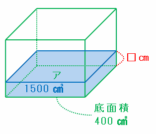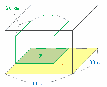 容器Aの底面積は30×30=900㎠、容器Bの底面積(図のア)は20×20=400㎠なので、イの部分の底面積は900-400=500㎠になります。