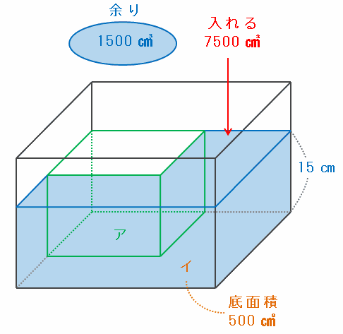 別の場所に移しておいた水を、次の図のようにイの部分(底面積500㎠)へ容器Bの高さと同じ15㎝になるまで入れると、その体積は500×15=7500㎤になります。