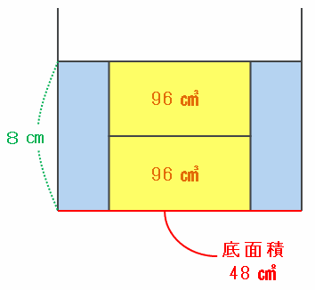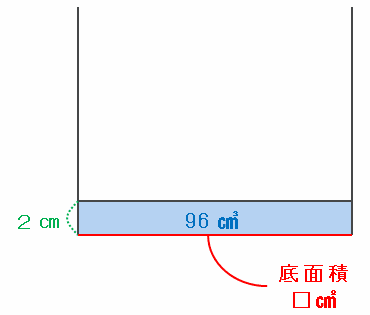 次の図のように、それが容器の深さ2㎝分の容積と等しいので、「容器の底面積×深さ2㎝=96㎤」という式に表すことができます。