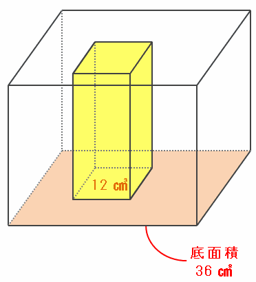 次に容器から水をすべて抜き、下の図のように直方体をたてに1個入れると、容器の底面積は48-3×4=36㎠に減ります。
