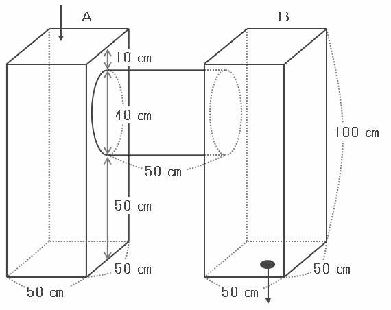 次の図のように、Aの水面の高さが40㎝になるまでに注いだ水は、円柱の管を通ってBへ流れることなく、すべてAの中へたまります。