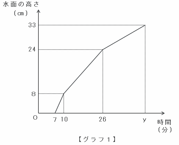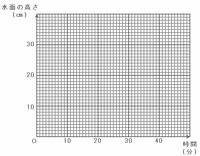 いま、水道管Aから毎分10リットルの割合で水を入れ始めました。底から200㎝のところまで水がたまったとき、排水管Bを開き毎分一定の量の水を出しました。グラフは、水を入れ始めてからの水面の高さの変化を表したものです。ただし、容器の厚さは考えないものとします。次の問いに答えなさい。