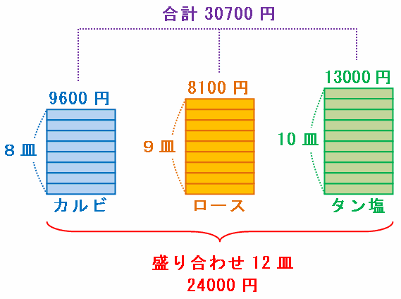 「47500÷6700=7余り600」というのは、「カルビ8皿+ロース9皿+タン塩10皿」と「盛り合わせ12皿」とのダイナミックな交換は7回までならOKですよ!という意味です。
