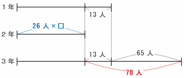 また、3年生は2年生よりも13+65=78人多いので、学年全体の人数は「26×□+78」という式で表せます。