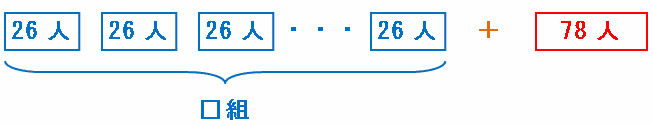 つまり「26×□+78」を図に表すと、次のように26人のグループがたくさんあって、さらに78人が余っている状態になります。