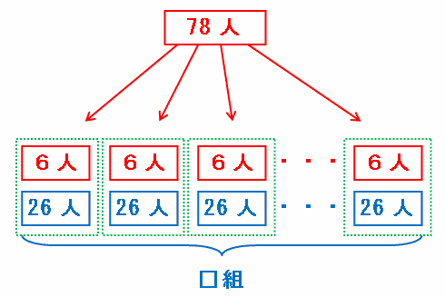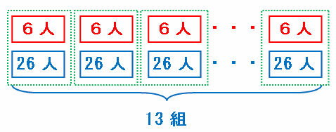 78÷6=13なので、上の図の赤い「6人」と青い「26人」をくっつける作業は全部で13回できます。