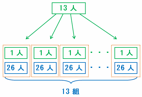 したがって次の図のように、余りの13人を1人ずつ「26人」とくっつけていけば、1年生の生徒を13組に分けることができるので、1年生の1クラスあたりの人数は26+1=27人になります。
