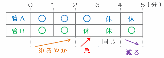 管Aは「3分開いて3分閉じる」、管Bは「2分開いて2分閉じる」の繰り返しなので、スタートから5分間の管AとBの動きを表にすると、次のようになります。