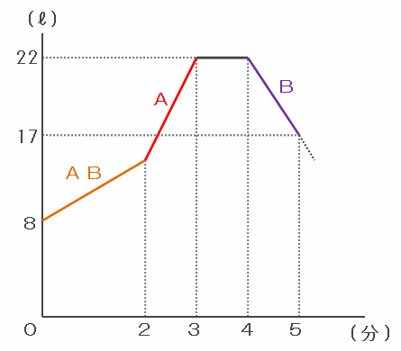 つまり、管Aから3分間にタンクへ注がれた水の量は14+5×2=24リットルなので、1分間あたりの水量は24÷3=8リットルになります。
