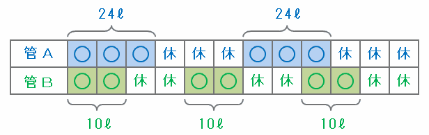 上の表を見れば分かるように、管Aは「3分開く」が2回あるので、12分間で8×3×2=48リットルの水がタンクへ注がれます。