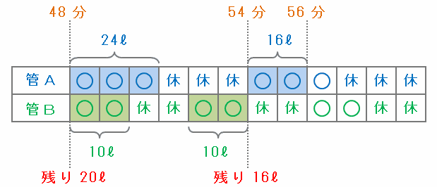次の表を見れば分かるように、54分からの2分間は管Aだけが開いているので、その間にタンクへ8×2=16リットルの水が注がれてちょうど満水になります。