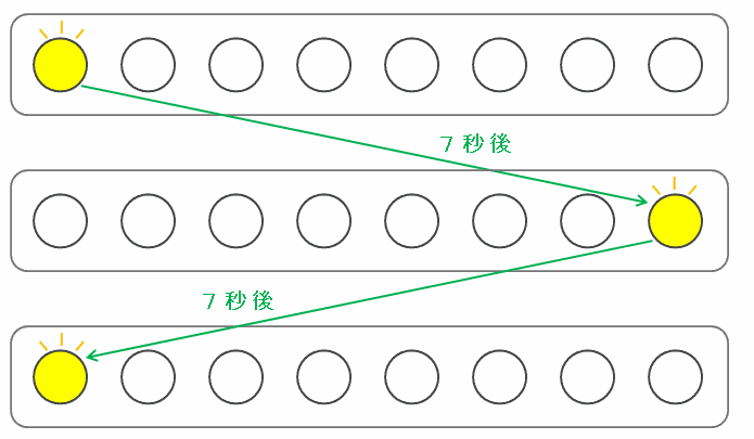 したがって、次の図で最初に左端のランプが点灯した後、右端のランプが点灯するまでにかかる時間は1×7=7秒、そして右端のランプが点灯してから左端のランプが点灯するまでにかかる時間も同じく7秒です。
