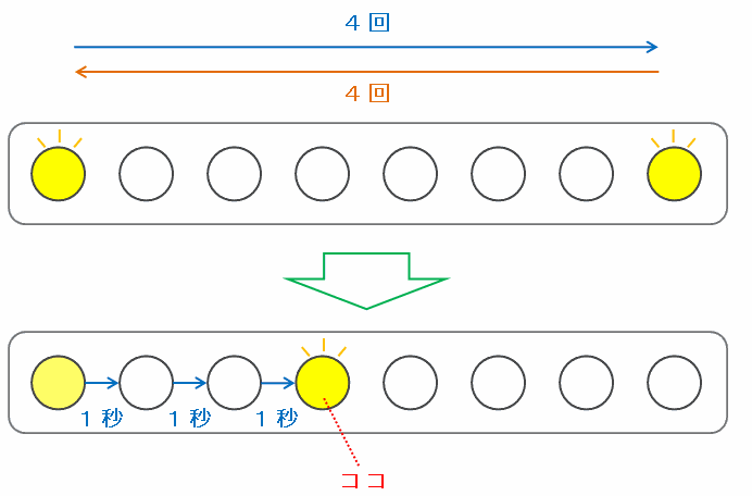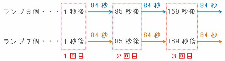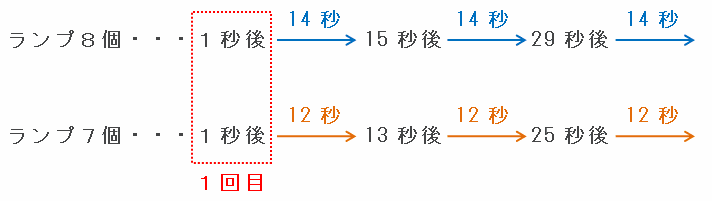 ランプ8個の場合、左端のランプが点灯してからもう一度点灯するまでにかかる時間は7×2=14秒です。