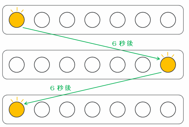 次の図で最初に左端のランプが点灯した後、右端のランプが点灯するまでにかかる時間は1×6=6秒、そして右端のランプが点灯してから左端のランプが点灯するまでにかかる時間も同じく6秒です。
